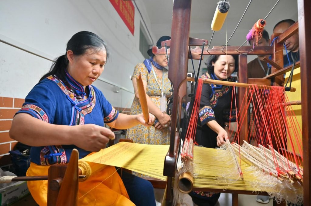 “过去壮锦的用途比较单一,主要用于背带、被面和被单。”壮族织锦技艺国家级代表性传承人、靖西市壮锦厂厂长李村灵告诉记者,数十年来,壮锦厂致力于织锦技术的研究与创新,壮锦产品丰富起来,“壁挂、桌布、围巾、手提包、摆件……我们还把壮锦融入旗袍、马面裙,让壮族人的浪漫可以随时穿戴在身上”。