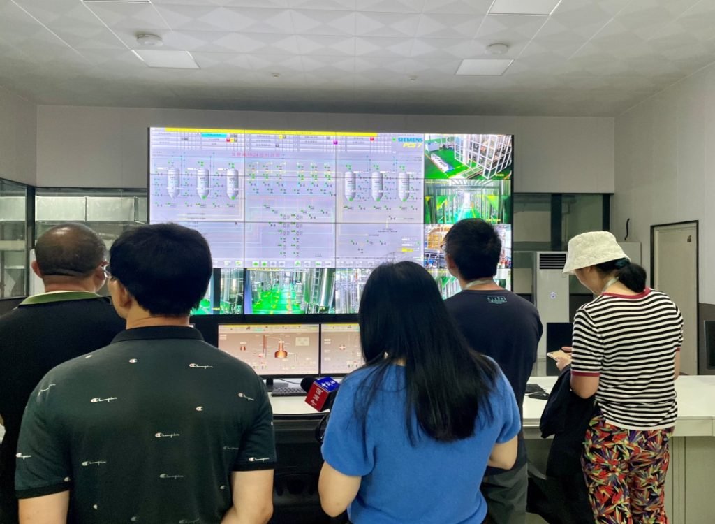 在中央控制中心,记者们看到工作人员轻点鼠标,可将原料处理中心、茶本酒生产车间、酒水处理及勾调中心、包装车间、技术中心、污水处理中心等生产环节一览无余。