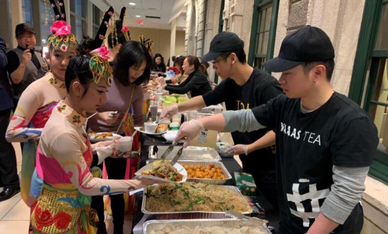 晚会前福祥小馆,饕客火锅,Yaaas 奶茶,TOA等华人餐饮业慷慨赞助美食饮料,为与会人员提供了水饺、炒菜、炒面等中式自助餐。