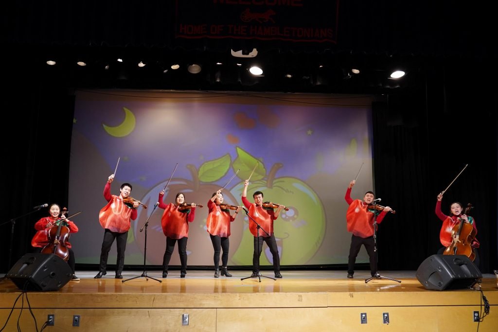 弦乐合奏《小苹果》的7位少年演员,动作活泼、技法娴熟。其中5位小提琴演奏者和1位大提琴手,竟然是来自一个家庭的同胞兄妹,难怪他们的诙谐表演配合得十分默契。