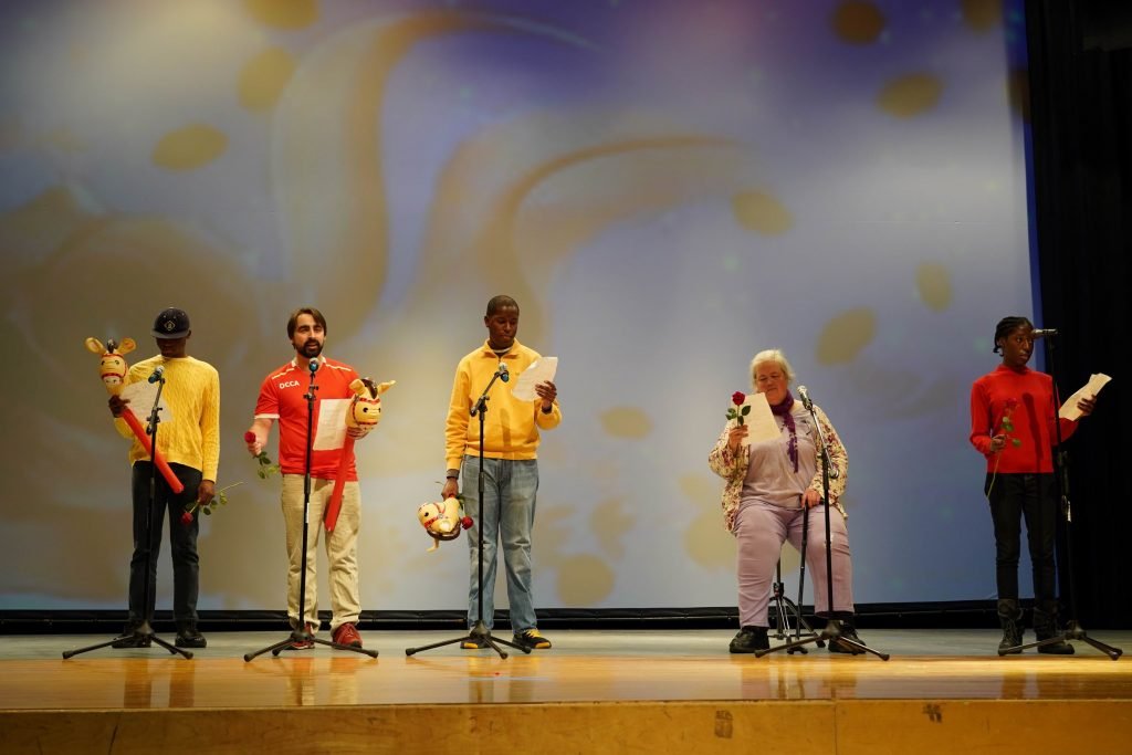 中文学校5名外族裔成人学员演唱的新疆哈萨克族民歌《可爱的一朵玫瑰花》,格外吸引观众。他们每人手持一支红色玫瑰,一边用中文朗诵歌词,一边演唱。根据歌词的意境,忽而高举玫瑰花,忽而模仿骑马的动作。准确的发音、惟妙惟肖的表演、把玫瑰花抛向观众席的结束动作,令现场掀起笑声和掌声的热潮。